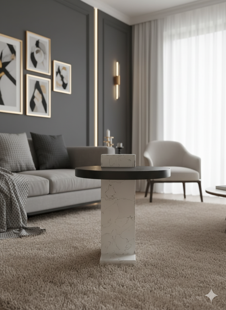Add sculptural charm to your interior with the Brock Side Table, a modern design piece that merges natural materials and contemporary geometry. Featuring contrasting marble pedestal supports—Carrara White and Marquina Black—this side table makes a bold statement with its dual round wooden tops in a staggered configuration.