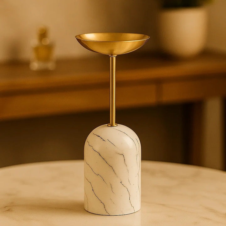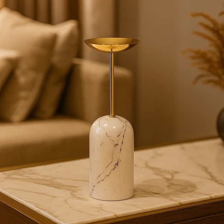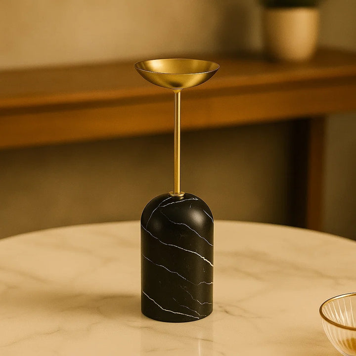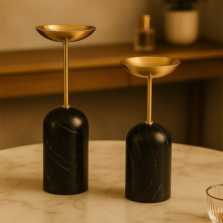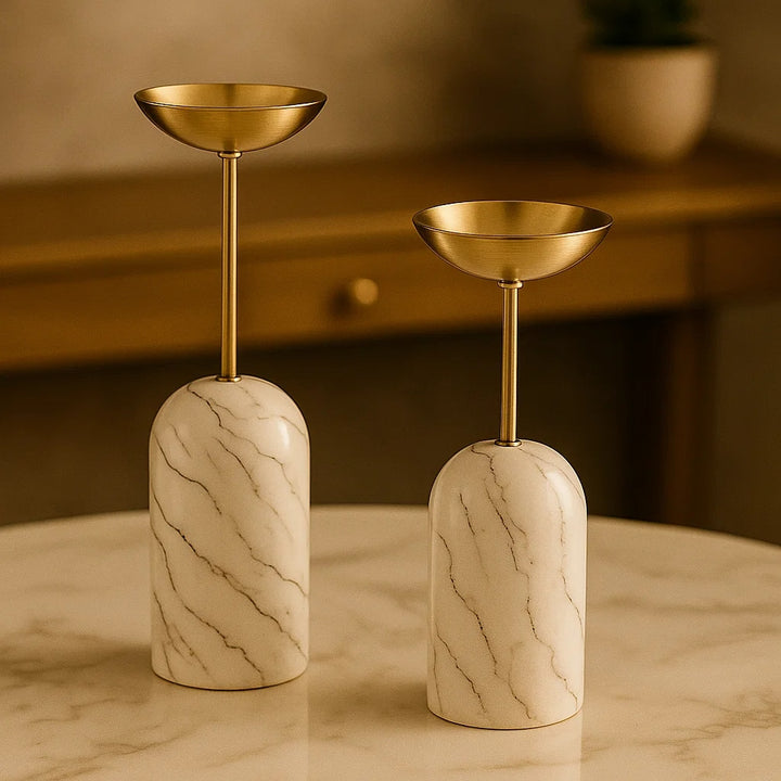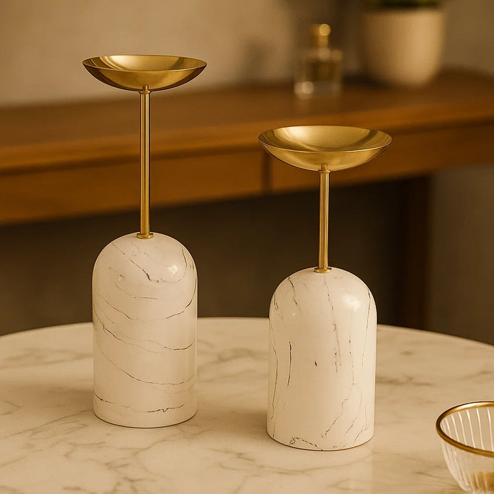 Made from Brass and Tavozza marble, this candle stand set is hand polished to add a touch of luxury and sophistication to any space. The rich texture and minimalist design with a sturdy base ensures stability and durability for your home.