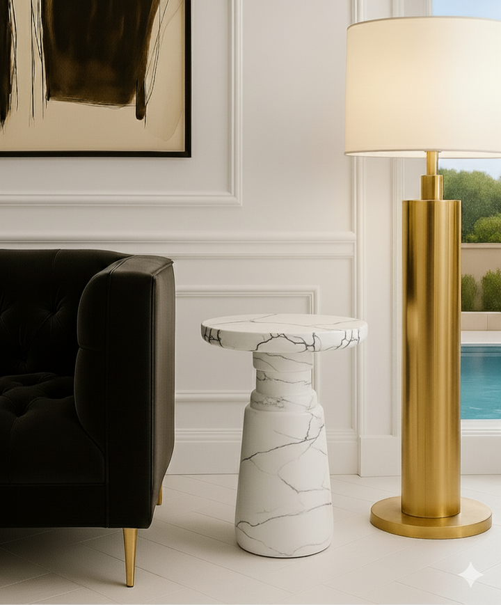 A compact yet striking accent piece, the Elga Side Table features a solid Tavozza marble base with clean geometric lines—perfect for adding timeless elegance to any modern living space.