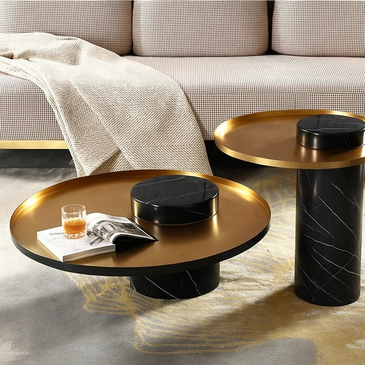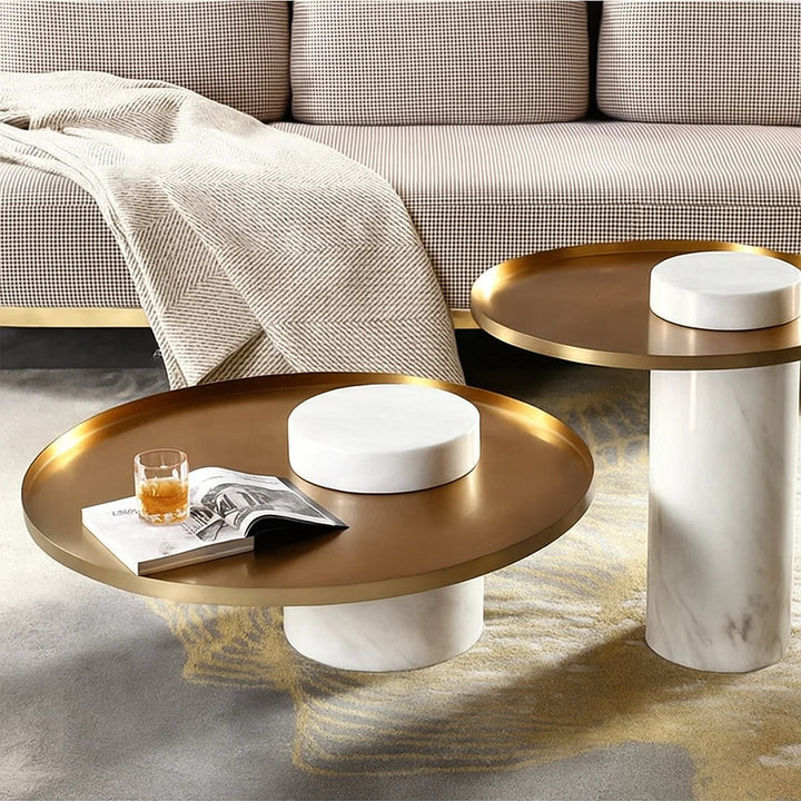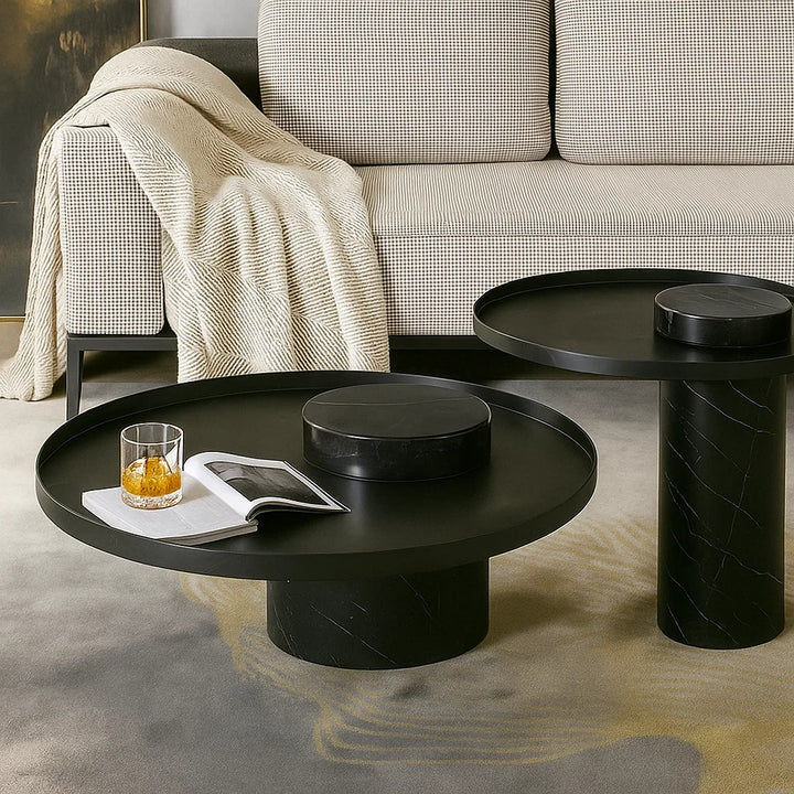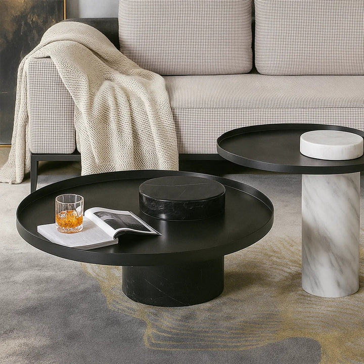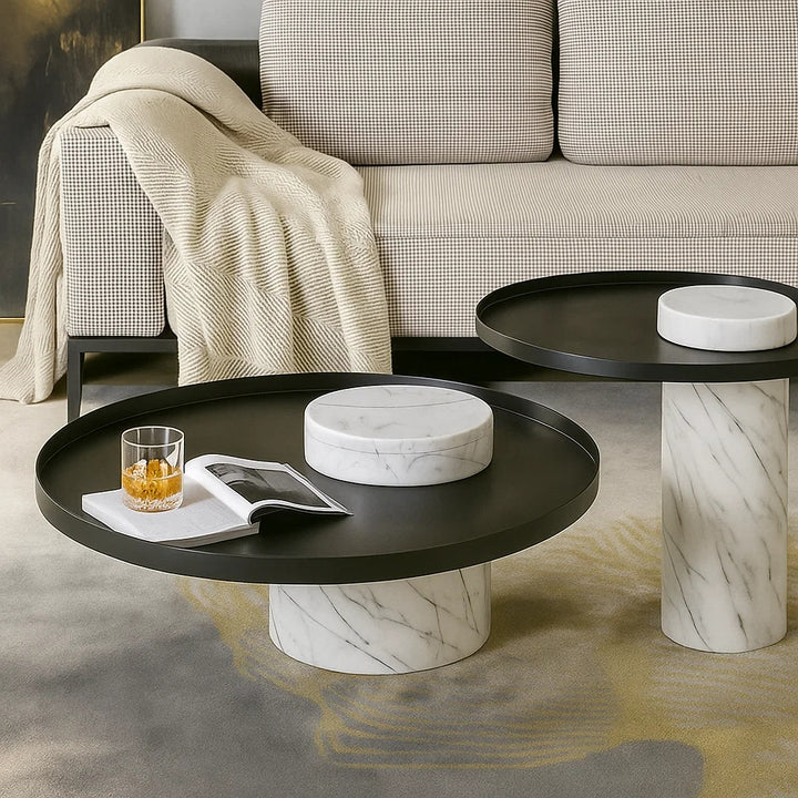 Elevate your living space with the Martin Marble Coffee Table Set, This elegant duo features a bold juxtaposition of geometry and material—highlighted by a luxurious round metal top resting gracefully on sculpted marble column bases. The smaller table stands on a white marble pillar, while the larger piece is anchored by black marble, offering a striking visual balance.